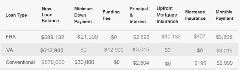 If you compare FHA,Conventional and VA from the chart below for a home of $600,000 you’ll find some easy advantages with the VA loan due to the 100% financing that’s available.